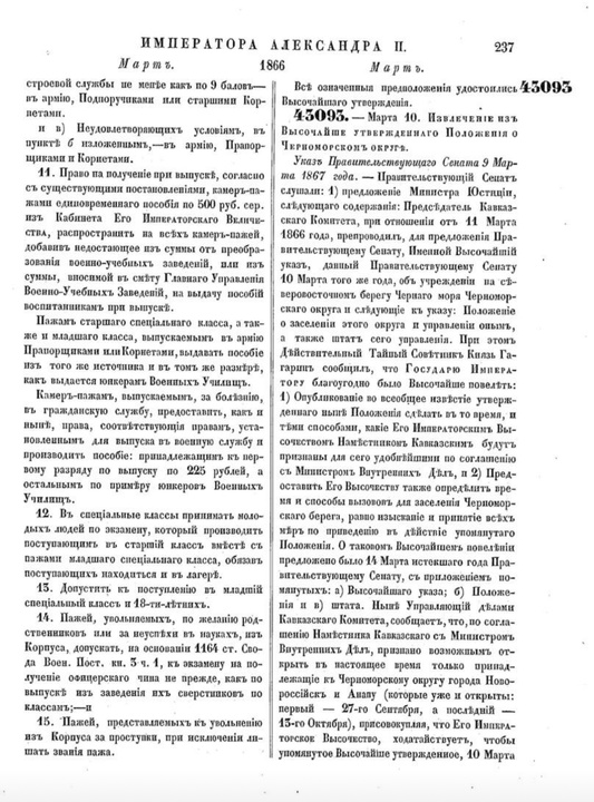 10 марта 1866 года было высочайше утверждено «Положение о заселении Черноморского округа и управлении оным». Новороссийск стал центром Черноморского округа.
