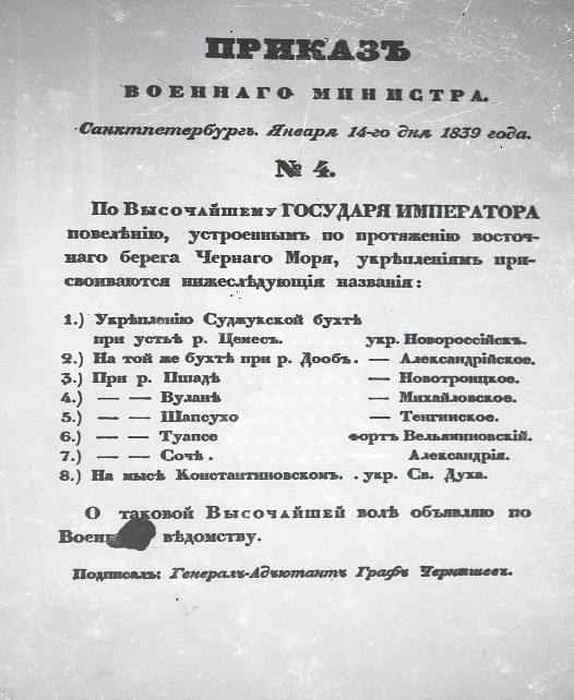 14 января 1839 года появился Приказ № 4 военного министра А.И. Чернышева, в котором сказано, что устроенному Укреплению в Суджукской бухте при устье реки Цемес присвоить наименование – «Укрепление Новороссийск».