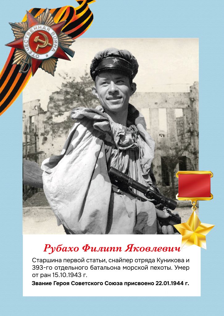 13 января 1923 года родился Рубахо Филипп Яковлевич – Герой Советского Союза, легендарный снайпер 393-го отдельного батальона морской пехоты. Ему было всего 20 лет, когда он умер от ран, полученных при освобождении Новороссийска.