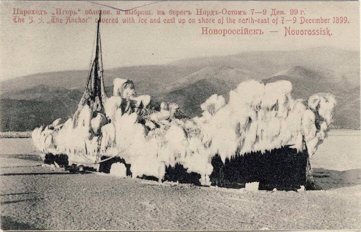 Можете себе представить, что это было: жители запертые в своих квартирах ледяным замком. Без пищи, без дров каково им было?.. Полиция принимала меры развозить провизию, но из этого ничего не вышло. А норд-ост ревел, клокотала бухта, где стояло множество судов. Работали без устали матросы. Но порывы боры усиливались и вот одним из них огромный пароход русского общества пароходства и торговли „Игорь” был выброшен на берег. На фотографическом снимке видно какую ему форму придал норд-ост. Кроме того были сорваны с якорей французские суда, „Cervin” и „Cura”, тоже обледеневшие. Также выброшено несколько паровых катеров на берег.