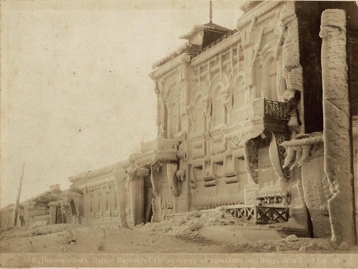 ‘С каждым днем бора становился свирепее. Уже были повалены почти все телеграфные и телефонные столбы, сорваны крыши, теперь леденел город, покрывались толщей льда ближняя к бухте постройки, представляя собой цепь домов, но какой фантастической, причудливой архитектуры! Это не были безвкусныя нелепые здания новороссийских жилищ и контор, нет — это были фантастические дворцы, сверкающие ярко на солнце! Какие-то волшебные удивительные дворцы, из которых ни выйти, ни взойдти невозможно: двери, окна все было обложено льдом, который по мере увеличения норд-оста, крепнул и рос.