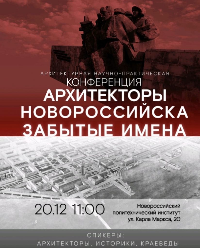 20 декабря в 11.00 состоится конференция Архитекторы Новороссийска. Забытые имена. Спикеры – архитекторы, историки, краеведы. 🗺️ Новороссийский политехнический институт (филиал) ФГБОУ ВПО “КубГТУ” ул. Карла Маркса, 20. Вход свободный. Организатор – Черноморский союз архитекторов.
