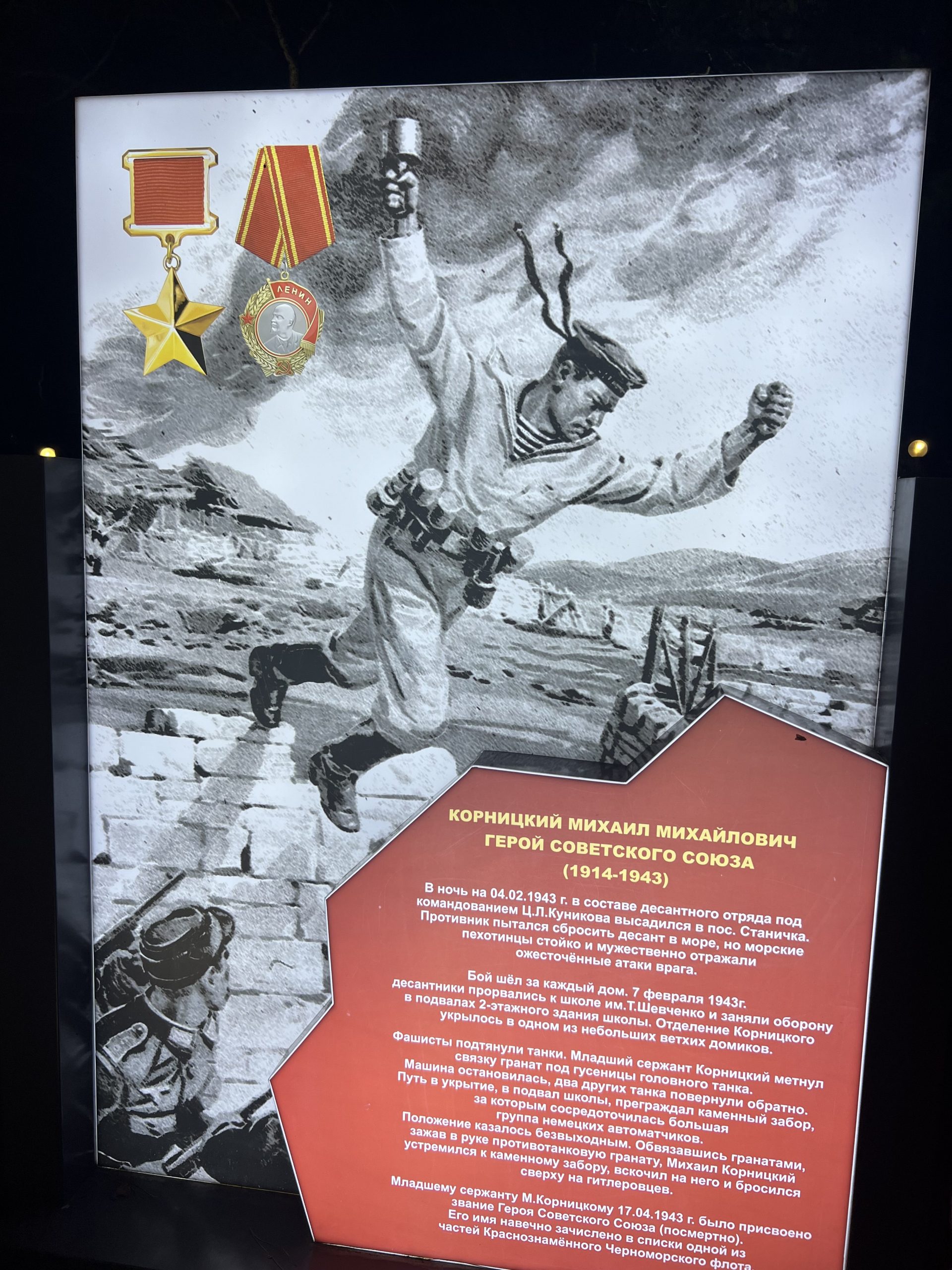 Михаил Михайлович высадился вторым эшелоном после Цезаря Куникова в холодную февральскую ночь с 3 на 4 февраля 1943 года. И в боях за расширение плацдарма его группа попала в окружение в районе, где сейчас находится 22 школа (ул. Суворовская, 5). Михаил принял отважное решение – ценой своей жизни спасти боевых друзей.